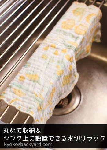 また、手洗いしたふきんを乾かすラックとしても使えます。ふきんの干し場所に困っていたので、これは嬉しい活用方法でした。