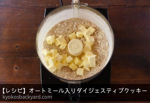 - バターを角切りにし、フードプロセッサーに入れて、連続運転で混ぜ合わせる。